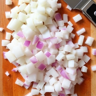 3. Chop the tomato and onion into small, square pieces to make them easier to mix.